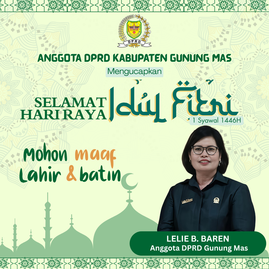 Iklan Anggota DPRD Gunung Mas Lelie B Baren Mengucapkan Selamat Hari Raya Idul Fitri jendelakalteng 30/03/2025 Bagikan Ke Sosial MediaAnggota DPRD Gunung Mas Mengucapkan Selamat Hari Raya Idul Fitri 1 Syawal 1446 H. Minal Aidzin Wal Faizin Mohon Maaf Lahir Batin.Anggota DPRD Gunung Mas: LELIE B.BAREN Post Views: 161Bagikan Ke Sosial MediaContinue ReadingPrevious Previous post: Pimpinan Beserta Pegawai Kantor Bappenda Kabupaten Gunung Mas Mengucapkan Selamat Hari Raya Idul FitriNext Next post: Pimpinan Beserta Pegawai Badan Kesbangpol Kabupaten Gunung Mas Mengucapkan Selamat Hari Raya Idul FitriTinggalkan Balasan Batalkan balasanAlamat email Anda tidak akan dipublikasikan. Ruas yang wajib ditandai *Komentar *Nama * Email * Situs Web Simpan nama, email, dan situs web saya pada peramban ini untuk komentar saya berikutnya. Related News Pengumuman Kehilangan : Lembar Sertifikat atas nama SALAMAT 02/07/2025 Pengumuman Kehilangan : Lembar Sertifikat Tanah atas nama SRI WATI 30/06/2025