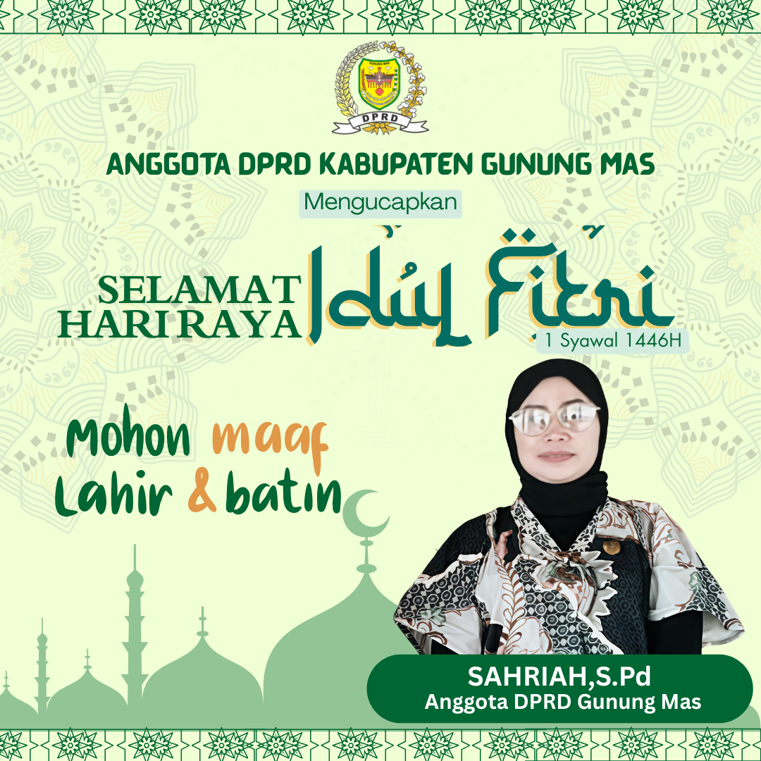 Iklan Anggota DPRD Gunung Mas Sahriah Mengucapkan Selamat Hari Raya Idul Fitri jendelakalteng 30/03/2025 Bagikan Ke Sosial MediaAnggota DPRD Gunung Mas Mengucapkan Selamat Hari Raya Idul Fitri 1 Syawal 1446 H. Minal Aidzin Wal Faizin Mohon Maaf Lahir Batin.Anggota DPRD Gunung Mas; SAHRIAH,S.Pd Post Views: 152Bagikan Ke Sosial MediaContinue ReadingPrevious Previous post: Pimpinan Beserta Pegawai Kantor Camat Sepang Mengucapkan Selamat Hari Raya Idul FitriNext Next post: Pimpinan Beserta Pegawai Bank Kalteng Cabang Kuala Kurun Mengucapkan Selamat Hari Raya Idul FitriTinggalkan Balasan Batalkan balasanAlamat email Anda tidak akan dipublikasikan. Ruas yang wajib ditandai *Komentar *Nama * Email * Situs Web Simpan nama, email, dan situs web saya pada peramban ini untuk komentar saya berikutnya. Related News Pengumuman Kehilangan : Lembar Sertifikat atas nama SALAMAT 02/07/2025 Pengumuman Kehilangan : Lembar Sertifikat Tanah atas nama SRI WATI 30/06/2025