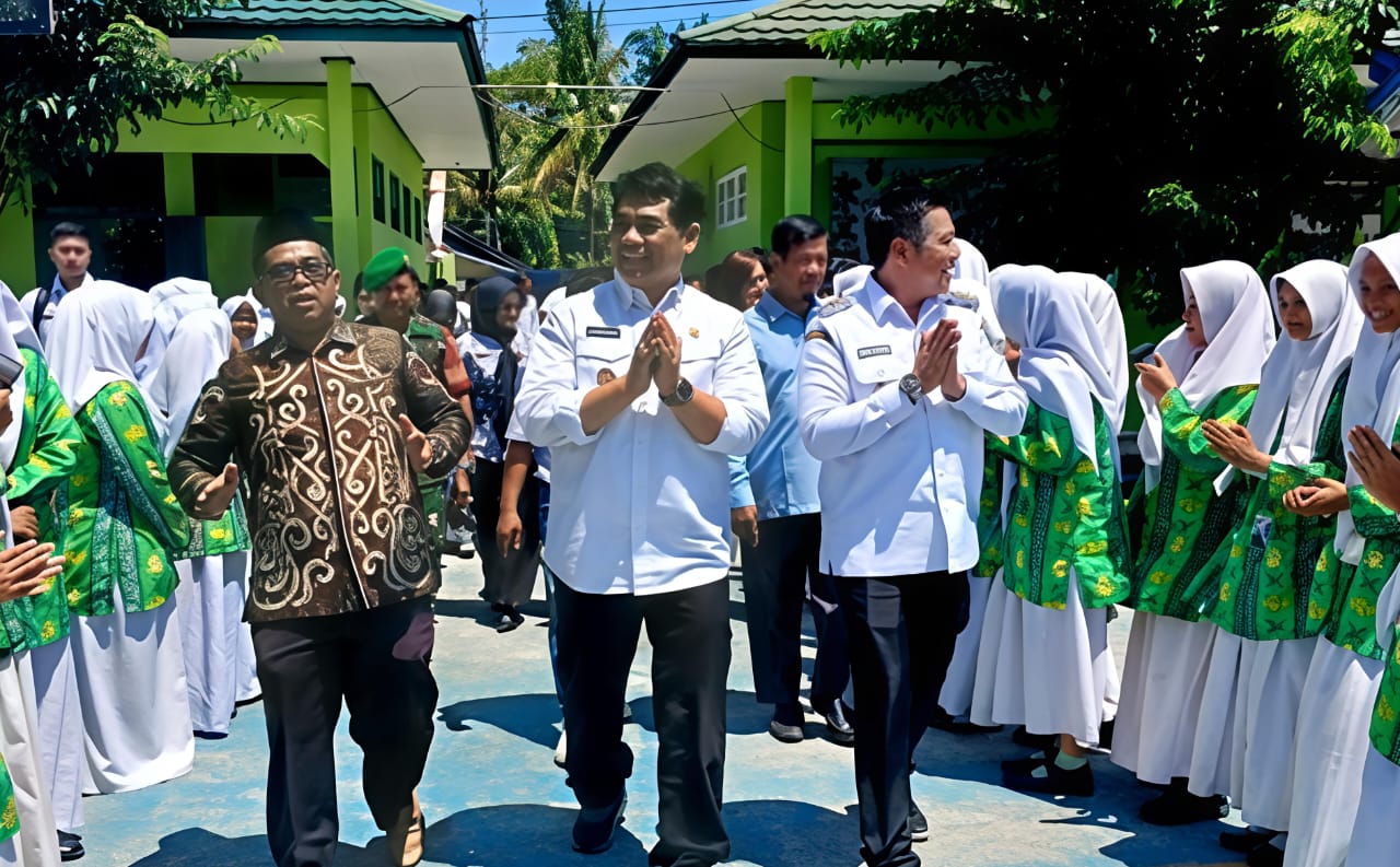 Foto. Bupati Bariut H Shalahuddin, Wabup Felix Sonadie Y Tingan dan Kepala MTsN Muara Teweh Mahlil Riduan saat peluncuran program BMG perdana di MTsN Muara Teweh, Rabu (15/10/2025).(Jendela Kalteng/Ist)