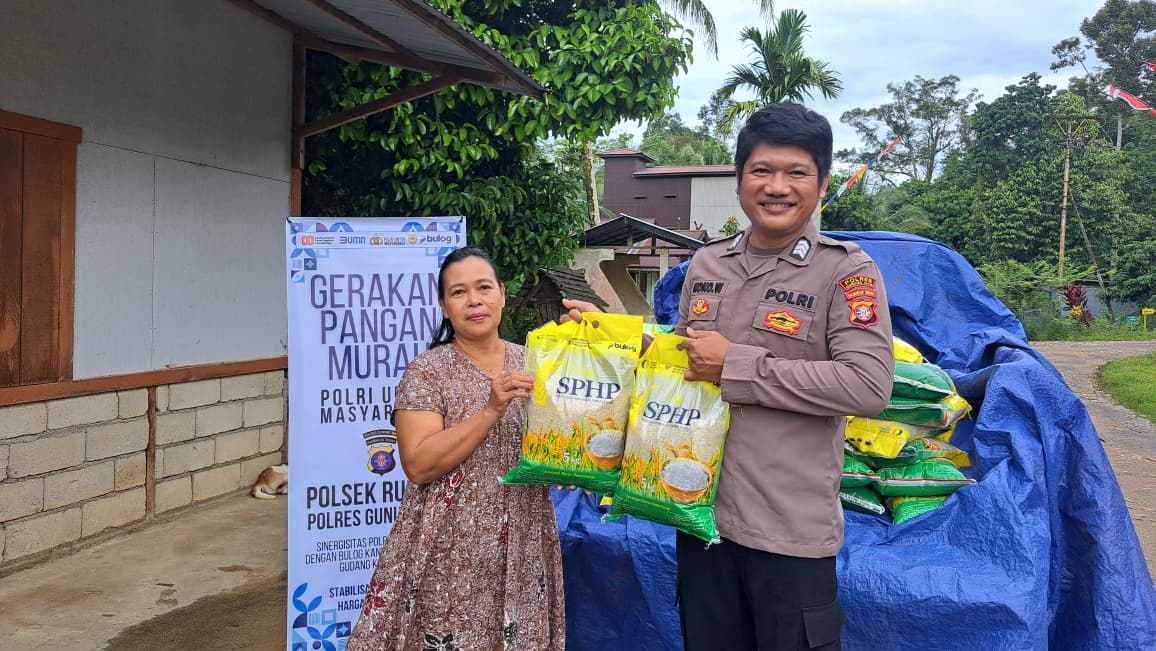 Foto. Jajaran Polsek Rungan, bersinergi dengan Perum Bulog Cabang Kuala Kurun menggelar Gerakan Pangan Murah (GPM).Sebanyak 500 Kg beras program SPHP ludes diserbu warga di Desa Tumbang Bunut, Kecamatan Rungan, Rabu (1/10/2025) pagi.(Jendela Kalteng/Ist)