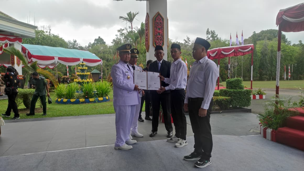 Dalam prosesi penyerahan itu, suasana khidmat masih terasa usai detik-detik proklamasi. Para tamu undangan, jajaran Forum Koordinasi Pimpinan Daerah (Forkopimda), hingga peserta upacara turut menyaksikan momen penting yang sarat makna tersebut.