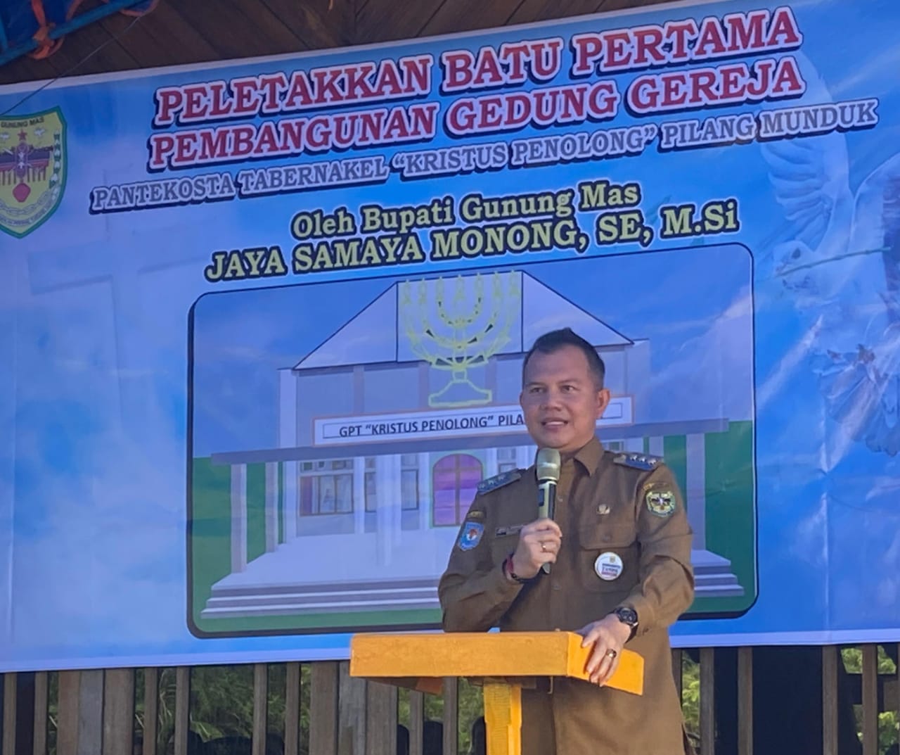 Foto.  Bupati Jaya Samaya Monong menyampaikan sambutan pada peletakkan batu pertama pembangunan gedung GPT Kristus Penolong Desa Pilang Munduk Kecamatan Kurun pada Senin (4/3/2024) pagi kemarin. (Jendela Kalteng/Ist)