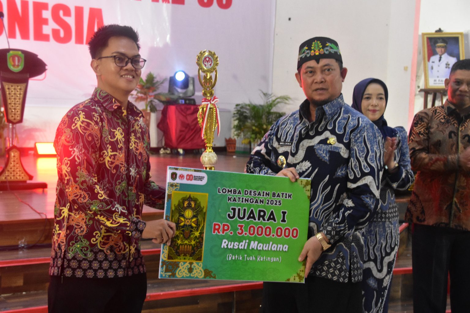 Dalam acara penyerahan penghargaan yang berlangsung meriah, Bupati Saiful secara langsung menyerahkan piala dan piagam kepada para juara. Salah satu yang menarik perhatian adalah karya Rusdi Maulana, yang berhasil meraih Juara I melalui desain bertema “Batik Tuah Katingan.” Karya tersebut dinilai mampu memadukan keindahan motif dengan nilai filosofi budaya lokal yang kental akan makna dan karakter daerah.