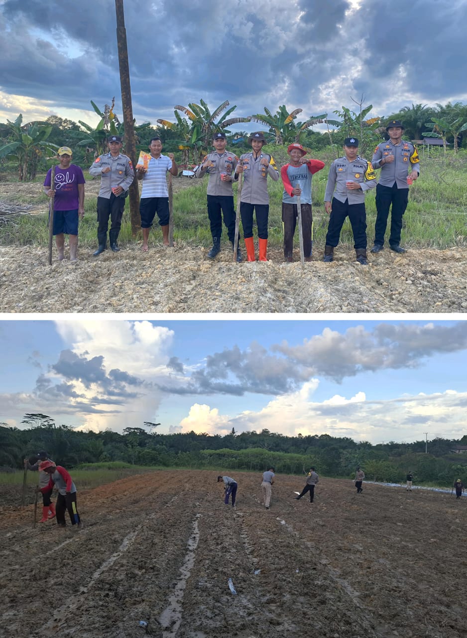 Foto. Bhabinkamtibmas Polsek Manuhing bersama sejumlah tokoh masyarakat dan warga Desa Bangun Sari,ketua kelompok tani dan ketua RT,menanam jagung hibrida di lahan desa setempat,Jumat (16/5/2025).(Jendela Kalteng/ist)
