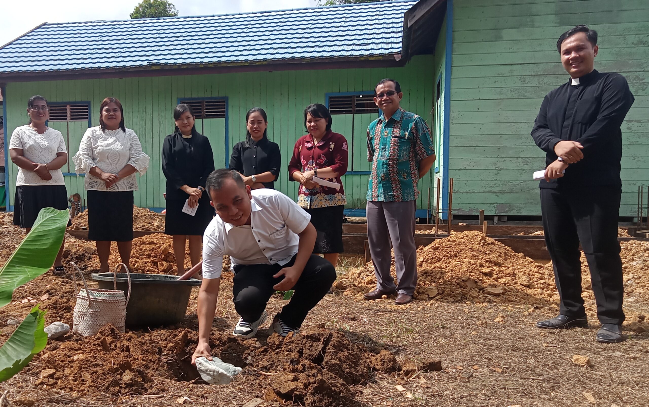 Foto. Anggota DPRD Evandi meletakan batu pertama pembangunan gedung baru GKE Panenga Desa Teluk Lawah, Kecamatan Tewah, Kamis (29/6). (Jendela Kalteng/nh)
