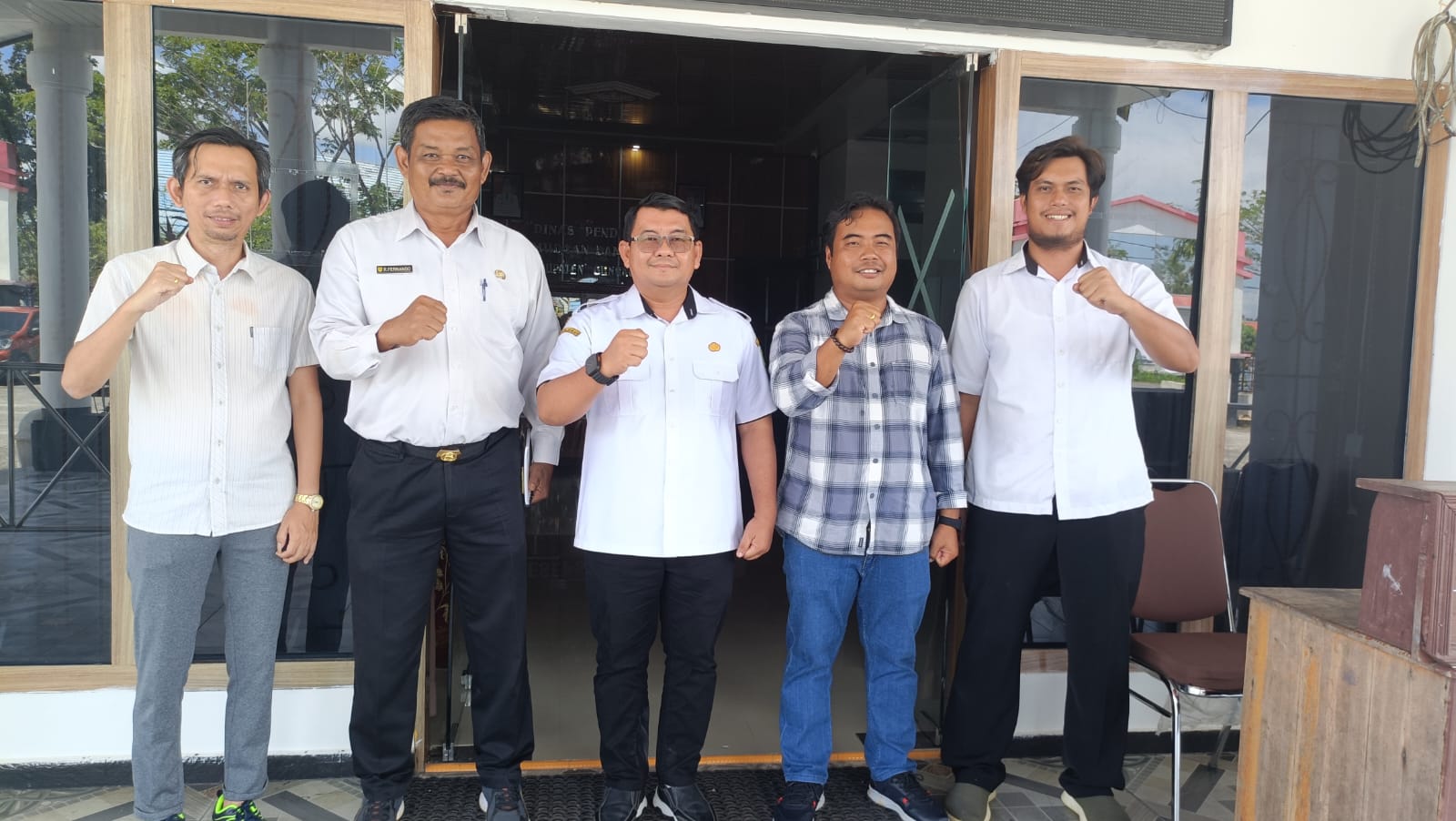 Foto. Ketua panitia pelaksana Kejurnas Grasstrack Regional IV Kalimantan Putaran II Tahun 2025 Hermanto (dua dari kanan) dan beberapa anggota panitia bersama Kadisdikpora Gumas Aprianto (tiga dari kiri).(Jendela Kalteng/nh)