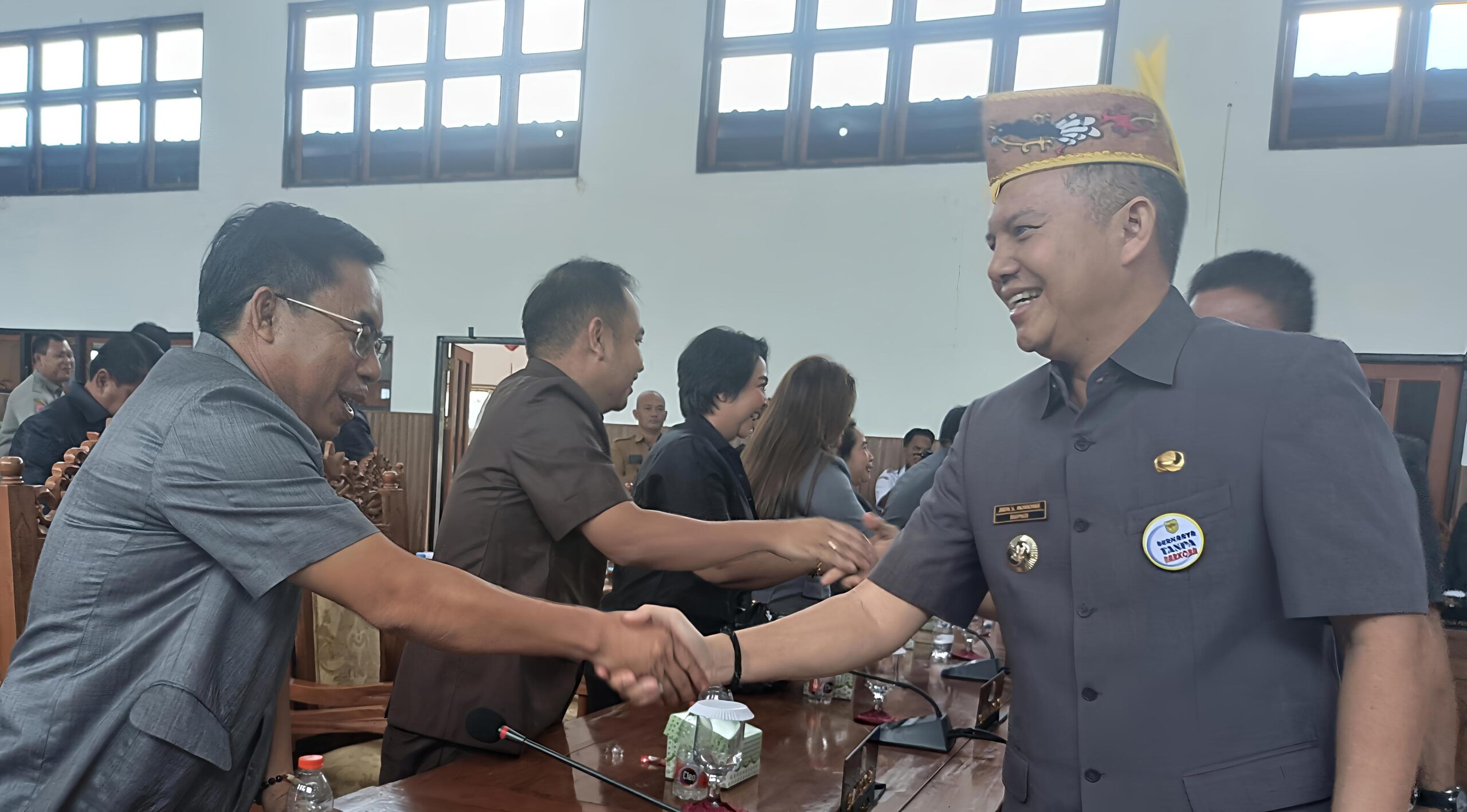 Foto. Bupati Jaya Samaya Monong akrab menyalami Anggota DPRD Gumas usai Rapat Paripurna ke-3 Masa Persidangan III tahun sidang 2025, Selasa (22/4/2025).(Jendela Kalteng/nh)