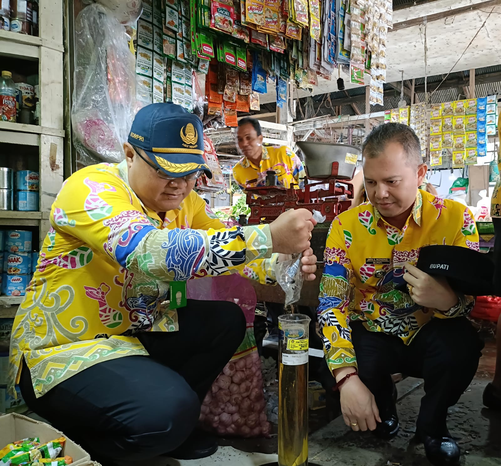 Foto. Bupati Gumas Jaya Samaya Monong saat mengecek takaran migor subsidi merek Minyakita dalam kemasan plastik di sebuah kios di pasar lama Kuala Kurun,Kamis (13/3/2025).(Jendela Kalteng/nh)