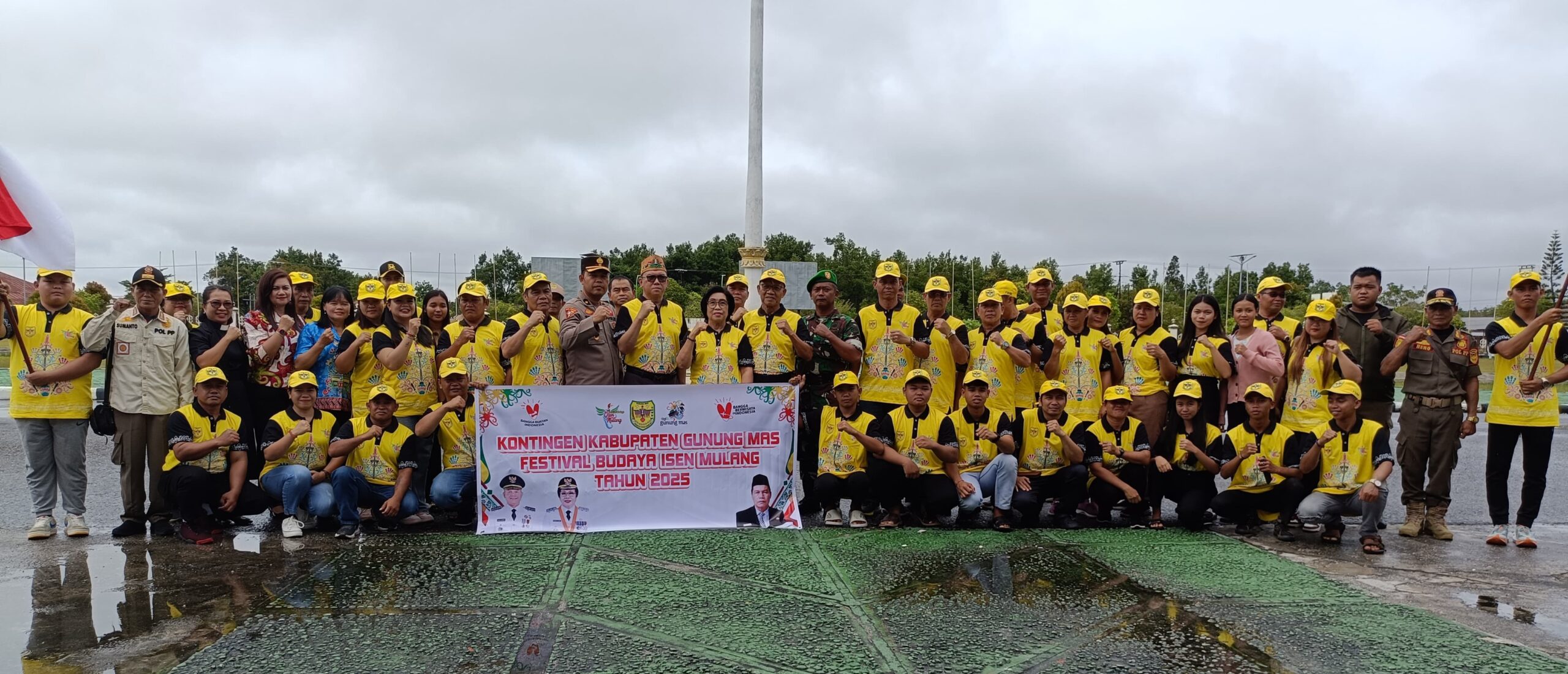 Wakil Bupati Gunung Mas (Wabup Gumas) Efrensia L.P Umbing melepas kontingen Kabupaten Gumas yang mengikuti Festifal Budaya Isen Mulang (FBIM) tingkat Provinsi Kalimantan Tengah (Kalteng) di Halaman Kantor Bupati Gumas,Sabtu (17/5/2025) pagi.
