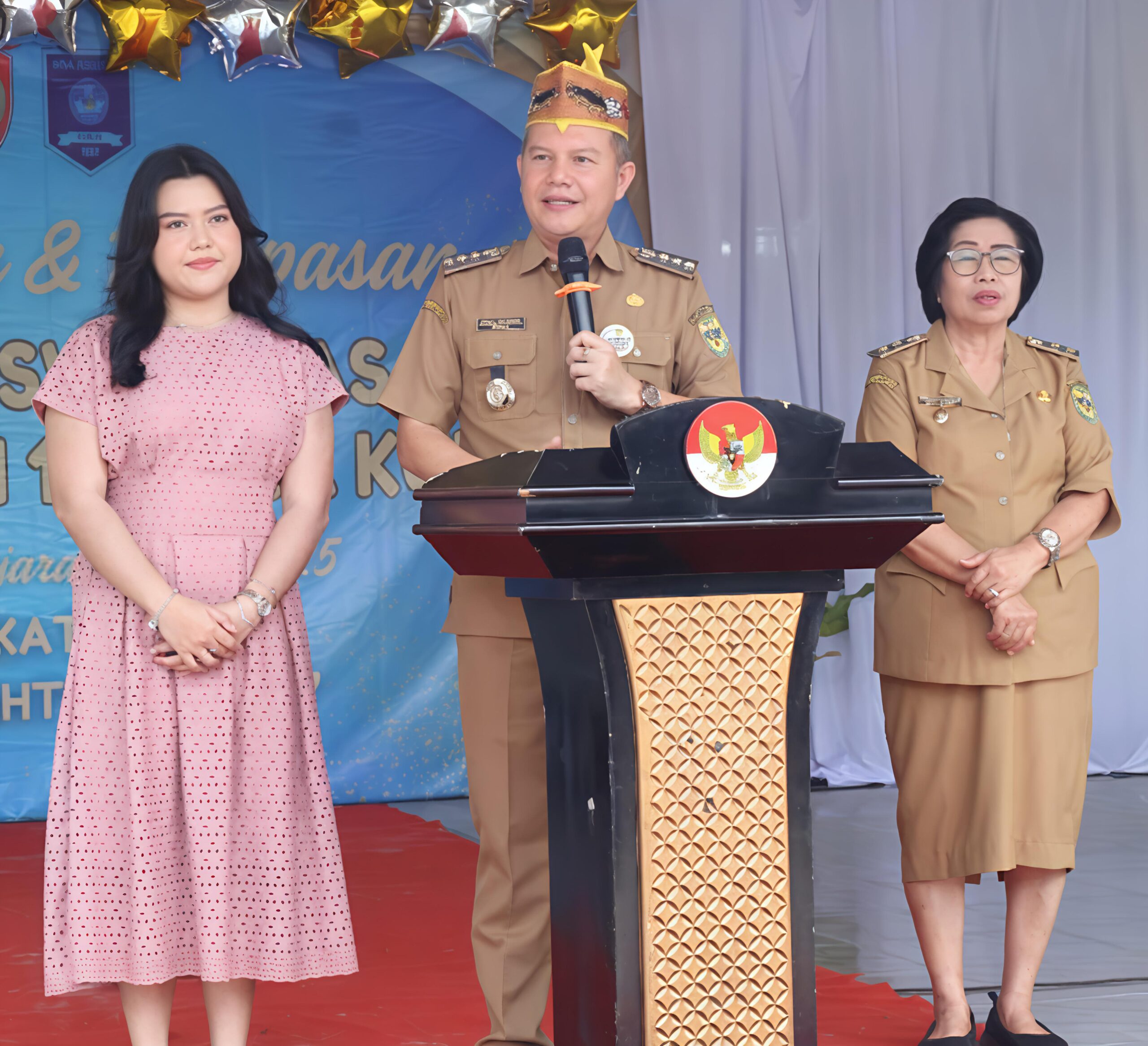 Foto. Bupati Gumas Jaya Samaya Monong didampingi Wabup Efrensia L.P Umbing dan Zefanya Naila, memberikan arahan saat menghadiri pengumuman kelulusan pelajar kelas XII SMAN 1 Kurun baru-baru ini di Halaman SMAN 1 Kurun.(Jendela Kalteng/ist)