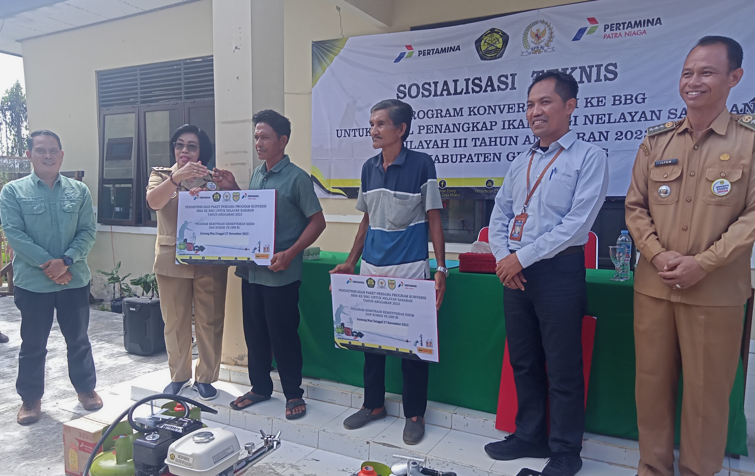 Penyerahan bantuan serta Sosialisasi Teknis Program Konversi BBM ke BBG untuk Kapal Penangkap Ikan Bagi Nelayan Sasaran di Gumas dilaksanakan di Halaman Kantor Kelurahan Tampang Tumbang Anjir, Senin (27/11).