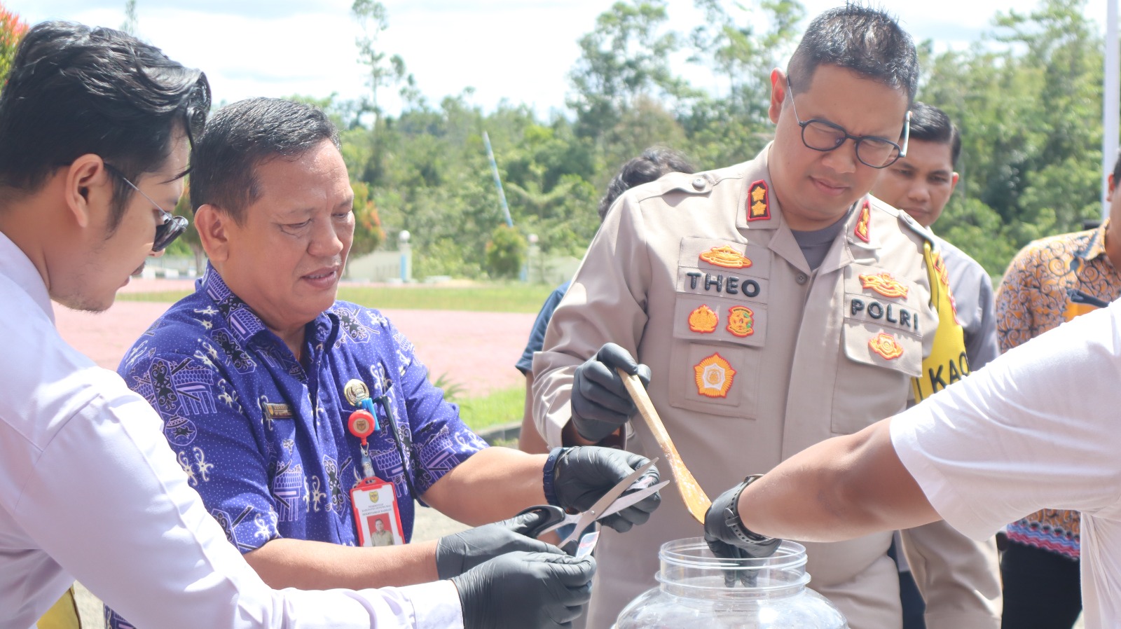 Foto. Staf Ahli Bupati Bidang Ekonomi, Keuangan dan Pembangunan Guanhin bersama Kapolres Gumas AKBP Theodorus Priyo Santosa, perwakilan unsur forkopimda, perwakilan dinas kesehatan dan P4GN Gumas serta Kasatresnarkoba Polres Gumas Iptu Abi, memusnahkan barang bukti sabu di Mapolres Gumas, Jumat (23/2/2024). (Jendela Kalteng/Ist)