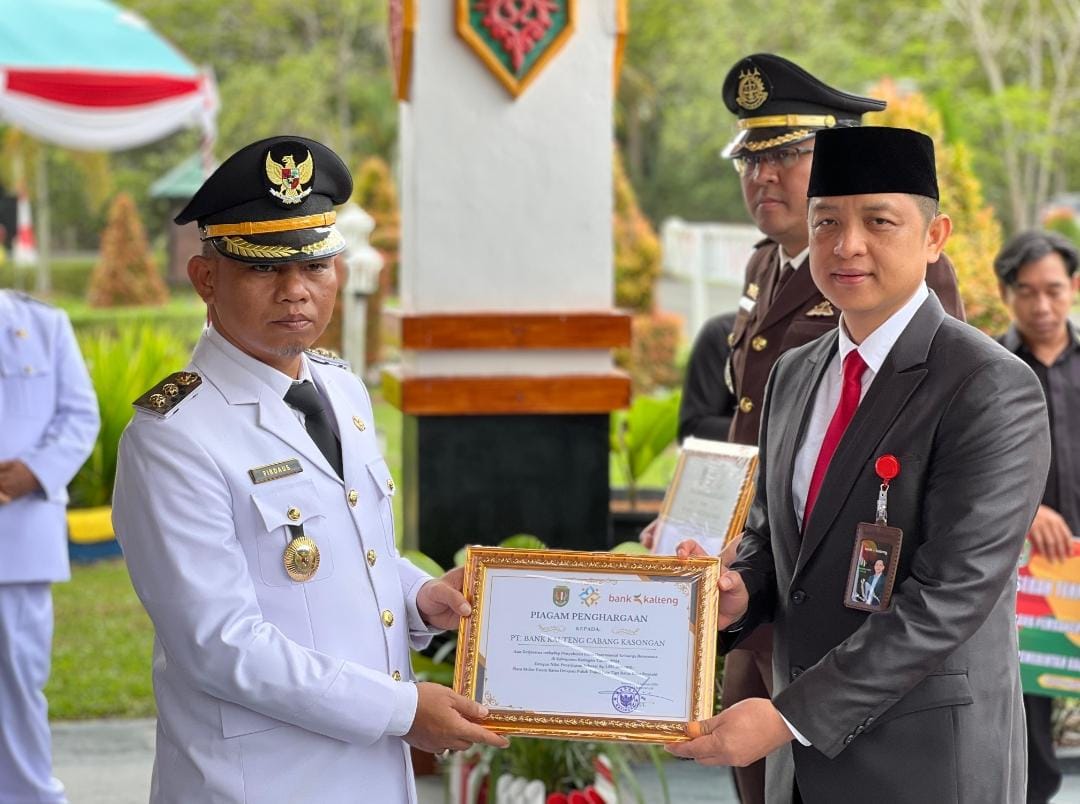 Wakil Bupati Katingan, Firdaus, saat menyerahkan piagam penghargaan Kepada Kepala Bank Kalteng Cabang Kasongan, Hendra Loren.