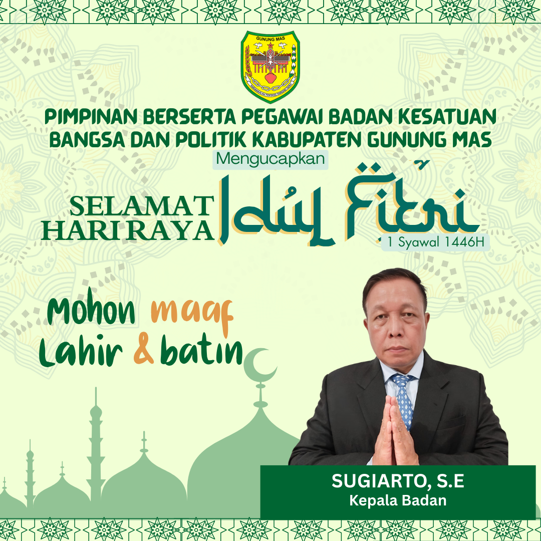 Iklan Pimpinan Beserta Pegawai Badan Kesbangpol Kabupaten Gunung Mas Mengucapkan Selamat Hari Raya Idul Fitri jendelakalteng 30/03/2025 Bagikan Ke Sosial MediaPimpinan Beserta Pegawai Badan Kesbangpol Kabupaten Gunung Mas Mengucapkan Selamat Hari Raya Idul Fitri 1 Syawal 1446 H. Minal Aidzin Wal Faizin Mohon Maaf Lahir Batin.Kepala Badan: SUGIARTO,S.E Post Views: 145Bagikan Ke Sosial MediaContinue ReadingPrevious Previous post: Anggota DPRD Gunung Mas Lelie B Baren Mengucapkan Selamat Hari Raya Idul FitriNext Next post: Wiyatno Tinjau Pos Terpadu Lebaran 2025 untuk Pastikan Keamanan dan Kenyamanan PemudikTinggalkan Balasan Batalkan balasanAlamat email Anda tidak akan dipublikasikan. Ruas yang wajib ditandai *Komentar *Nama * Email * Situs Web Simpan nama, email, dan situs web saya pada peramban ini untuk komentar saya berikutnya. Related News Pengumuman Kehilangan : Lembar Sertifikat atas nama SALAMAT 02/07/2025 Pengumuman Kehilangan : Lembar Sertifikat Tanah atas nama SRI WATI 30/06/2025