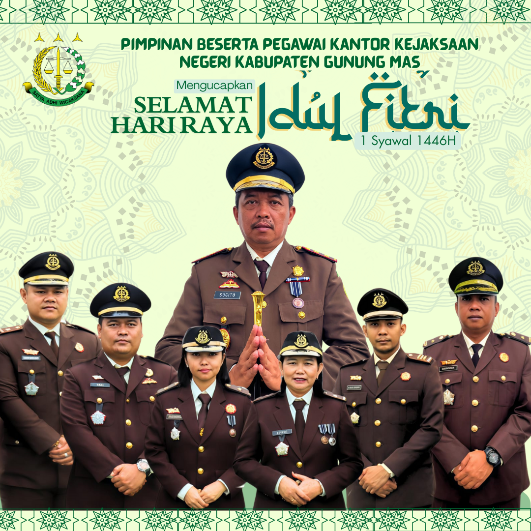 Iklan Pimpinan Beserta Pegawai Kantor Kejaksaan Negeri Kabupaten Gunung Mas Mengucapkan Selamat Hari Raya Idul Fitri20- jendelakalteng 30/03/2025 Bagikan Ke Sosial MediaPimpinan Beserta Pegawai Kantor Kejaksaan Negeri Kabupaten Gunung Mas Mengucapkan Selamat Hari Raya Idul Fitri 1 Syawal 1446 H. Minal Aidzin Wal Faizin Mohon Maaf Lahir Batin.Kajari: SUGITO,S.H Post Views: 181Bagikan Ke Sosial MediaContinue ReadingPrevious Previous post: Anggota DPRD Gunung Mas Neni Yuliani Mengucapkan Selamat Hari Raya Idul FitriNext Next post: Kepala Desa Beserta Perangkat Desa Tumbang Ponyoi Mengucapkan Selamat Hari Raya Idul FitriTinggalkan Balasan Batalkan balasanAlamat email Anda tidak akan dipublikasikan. Ruas yang wajib ditandai *Komentar *Nama * Email * Situs Web Simpan nama, email, dan situs web saya pada peramban ini untuk komentar saya berikutnya. Related News Pengumuman Kehilangan : Lembar Sertifikat atas nama SALAMAT 02/07/2025 Pengumuman Kehilangan : Lembar Sertifikat Tanah atas nama SRI WATI 30/06/2025