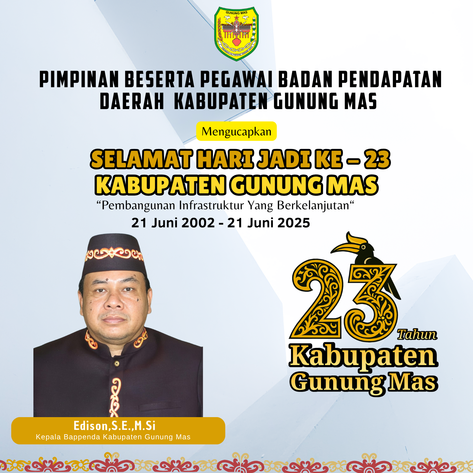 Iklan Pimpinan beserta seluruh pegawai Badan Pendapatan Daerah Kabupaten Gunung Mas mengucapkan Selamat Hari Jadi ke-23 Kabupaten Gunung Mas jendelakalteng 17/06/2025 Bagikan Ke Sosial MediaPimpinan beserta seluruh pegawai Badan Pendapatan Daerah Kabupaten Gunung Mas mengucapkan:Selamat Hari Jadi ke-23 Kabupaten Gunung Mas šSemoga semakin maju, sejahtera, dan berkeadilan bagi seluruh masyarakatnya. Post Views: 118Bagikan Ke Sosial MediaContinue ReadingPrevious Previous post: Pimpinan beserta seluruh staf Kantor Kejaksaan Negeri Kabupaten Gunung Mas mengucapkan Selamat Hari Jadi ke-23 Kabupaten Gunung MasNext Next post: Pimpinan beserta seluruh pegawai Badan Keuangan dan Aset Daerah (BKAD) Kabupaten Gunung Mas mengucapkan Selamat Hari Jadi ke-23 Kabupaten Gunung MasTinggalkan Balasan Batalkan balasanAlamat email Anda tidak akan dipublikasikan. Ruas yang wajib ditandai *Komentar *Nama * Email * Situs Web Simpan nama, email, dan situs web saya pada peramban ini untuk komentar saya berikutnya. Related News Pengumuman Kehilangan : Lembar Sertifikat atas nama SALAMAT 02/07/2025 Pengumuman Kehilangan : Lembar Sertifikat Tanah atas nama SRI WATI 30/06/2025
