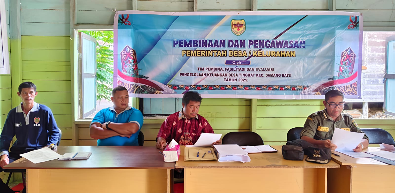 Foto. Camat Damang Batu Sudirman (ujung kanan) bersama tim Pembina, Fasilitasi, dan Evaluasi Pengelolaan Keuangan Desa tingkat Kecamatan Damang Batu Jumat (7/3/2025) lalu melaksanakan kunjungan Pembinaan dan Pengawasan ke Desa Tumbang Posu. (Jendela Kalteng/Ist)