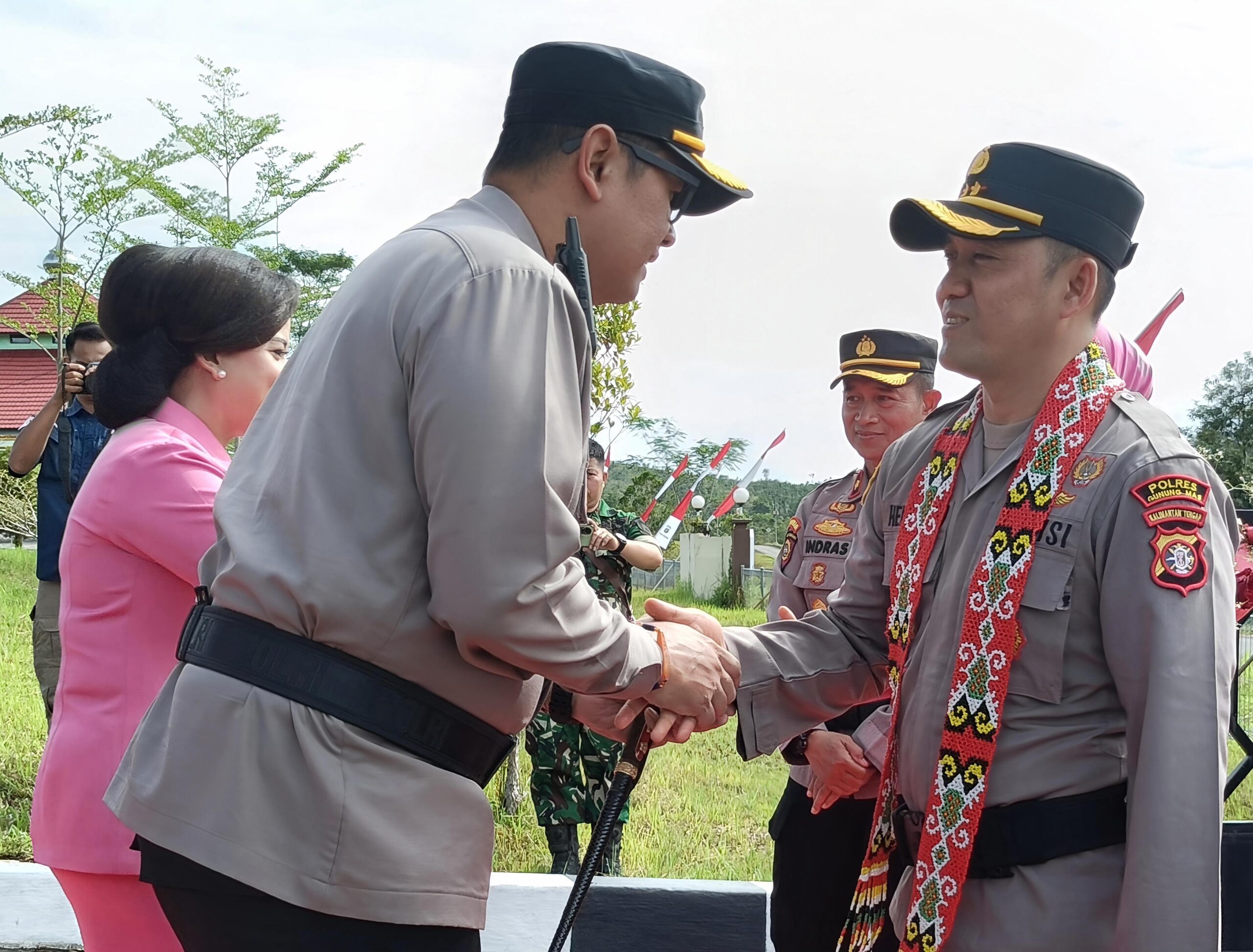 Foto. Kapolres Gumas sebelumnya AKBP Theodorus Priyo Santosa,S.I.K (kiri) menyambut hangat Kapolres Gumas yang baru AKBP Heru Eko Wibowo,S.I.K.,M.H di Mako Polres Gumas,Selasa (15/4/2025) pagi. (Jendela Kalteng/nh)
