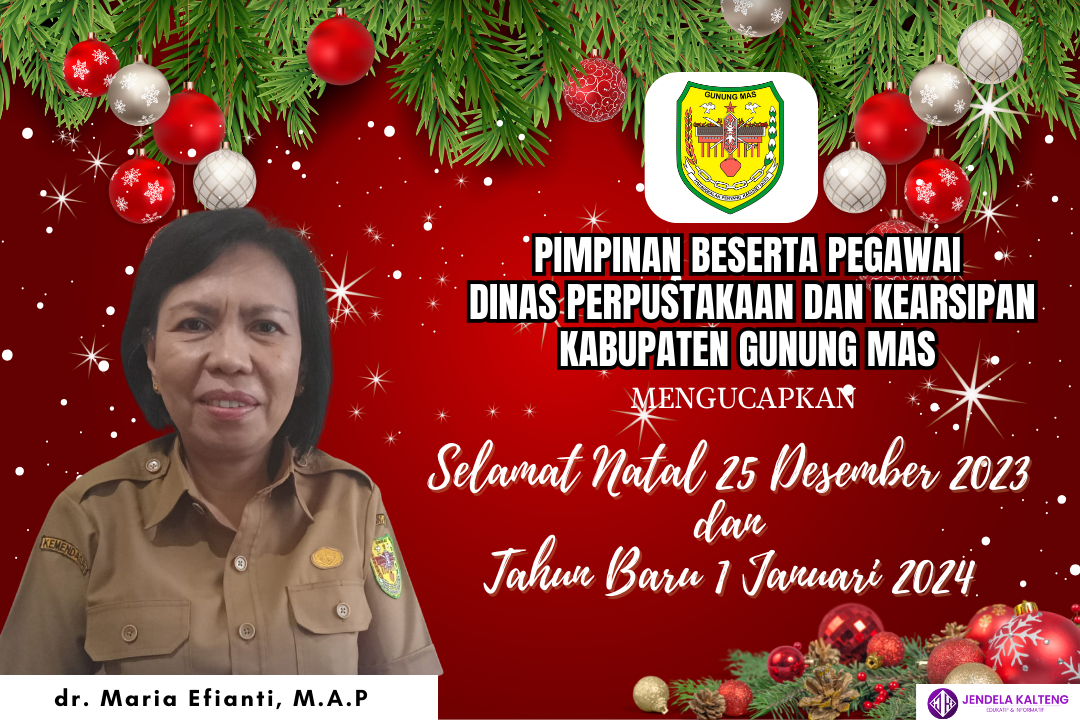 Iklan Ucapan Selamat Natal dan Tahun Baru Dinas Perpustakaan dan Kearsipan Kabupaten Gunung Mas jendelakalteng 24/12/2023 Pimpinan Beserta Pegawai Dinas Perpustakaan dan Kearsipan Kabupaten Gunung Mas Mengucapkan Selamat Merayakan Natal 25 Desember 2023 dan Tahun Baru 1 Januari 2024.Kepala Dinas: dr. Maria Efianti, M.A.P Post Views: 152Continue ReadingPrevious Previous post: Ucapan Selamat Natal dan Tahun Baru Dinas Transmigrasi, Tenaga Kerja, Koperasi dan Usaha Kecil dan Menengah Kabupaten Gunung MasNext Next post: Ucapan Selamat Natal dan Tahun Baru Gudang Bulog Kuala KurunTinggalkan Balasan Batalkan balasanAlamat email Anda tidak akan dipublikasikan. Ruas yang wajib ditandai *Komentar *Nama * Email * Situs Web Simpan nama, email, dan situs web saya pada peramban ini untuk komentar saya berikutnya. Related News Pengumuman Kehilangan : Lembar Sertifikat atas nama SALAMAT 02/07/2025 Pengumuman Kehilangan : Lembar Sertifikat Tanah atas nama SRI WATI 30/06/2025