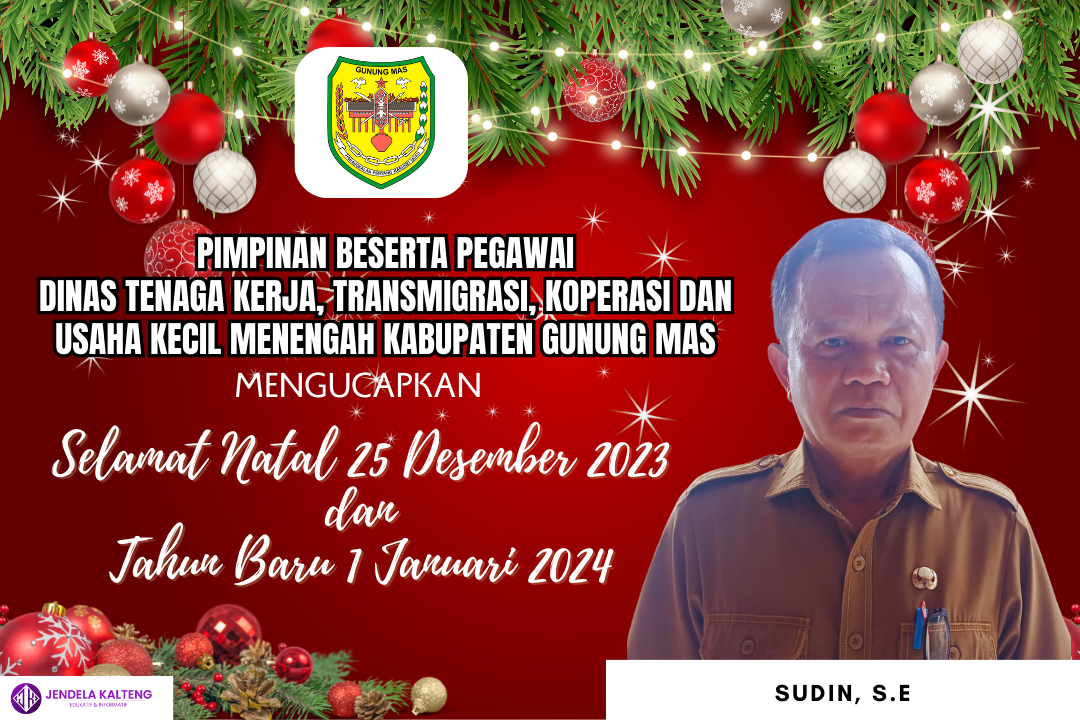 Iklan Ucapan Selamat Natal dan Tahun Baru Dinas Transmigrasi, Tenaga Kerja, Koperasi dan Usaha Kecil dan Menengah Kabupaten Gunung Mas jendelakalteng 24/12/2023 Pimpinan Beserta Pegawai Dinas Transmigrasi, Tenaga Kerja, Koperasi dan Usaha Kecil dan Menengah Kabupaten Gunung Mas Mengucapkan Selamat Merayakan Natal 25 Desember 2023 dan Tahun Baru 1 Januari 2024.Kadis: Sudin, S.E Post Views: 256Continue ReadingPrevious Previous post: Ucapan Selamat Natal dan Tahun Baru Badan Kesatuan Bangsa dan Politik Kabupaten Gunung MasNext Next post: Ucapan Selamat Natal dan Tahun Baru Dinas Perpustakaan dan Kearsipan Kabupaten Gunung MasTinggalkan Balasan Batalkan balasanAlamat email Anda tidak akan dipublikasikan. Ruas yang wajib ditandai *Komentar *Nama * Email * Situs Web Simpan nama, email, dan situs web saya pada peramban ini untuk komentar saya berikutnya. Related News Pengumuman Kehilangan : Lembar Sertifikat atas nama SALAMAT 02/07/2025 Pengumuman Kehilangan : Lembar Sertifikat Tanah atas nama SRI WATI 30/06/2025