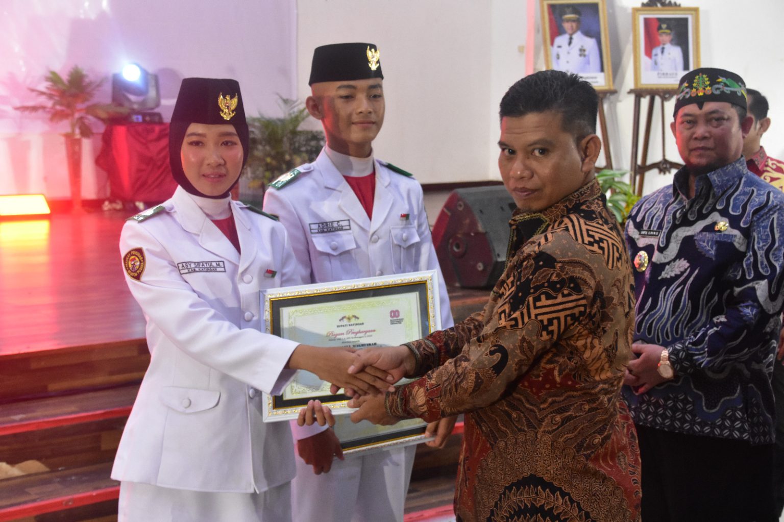 Wakil Bupati Katingan, Firdaus, saat menyerahkan piagam penghargaan kepada Paskibraka yang telah melaksanakan tugas mengibarkan bendera pada peringatan HUT RI Ke-80 di Kabupaten Katingan